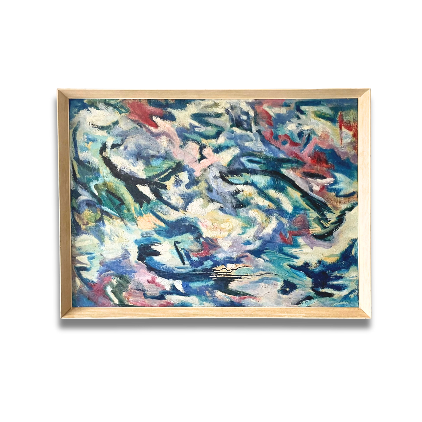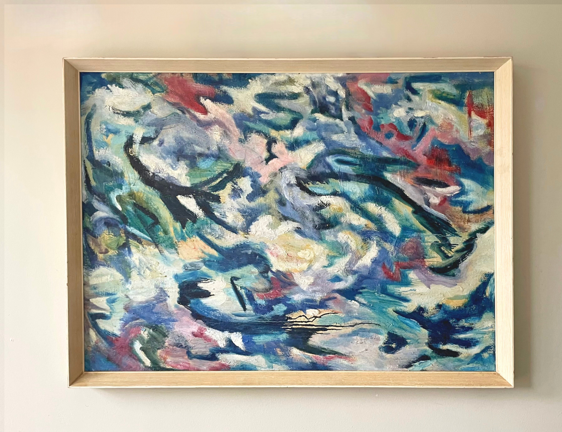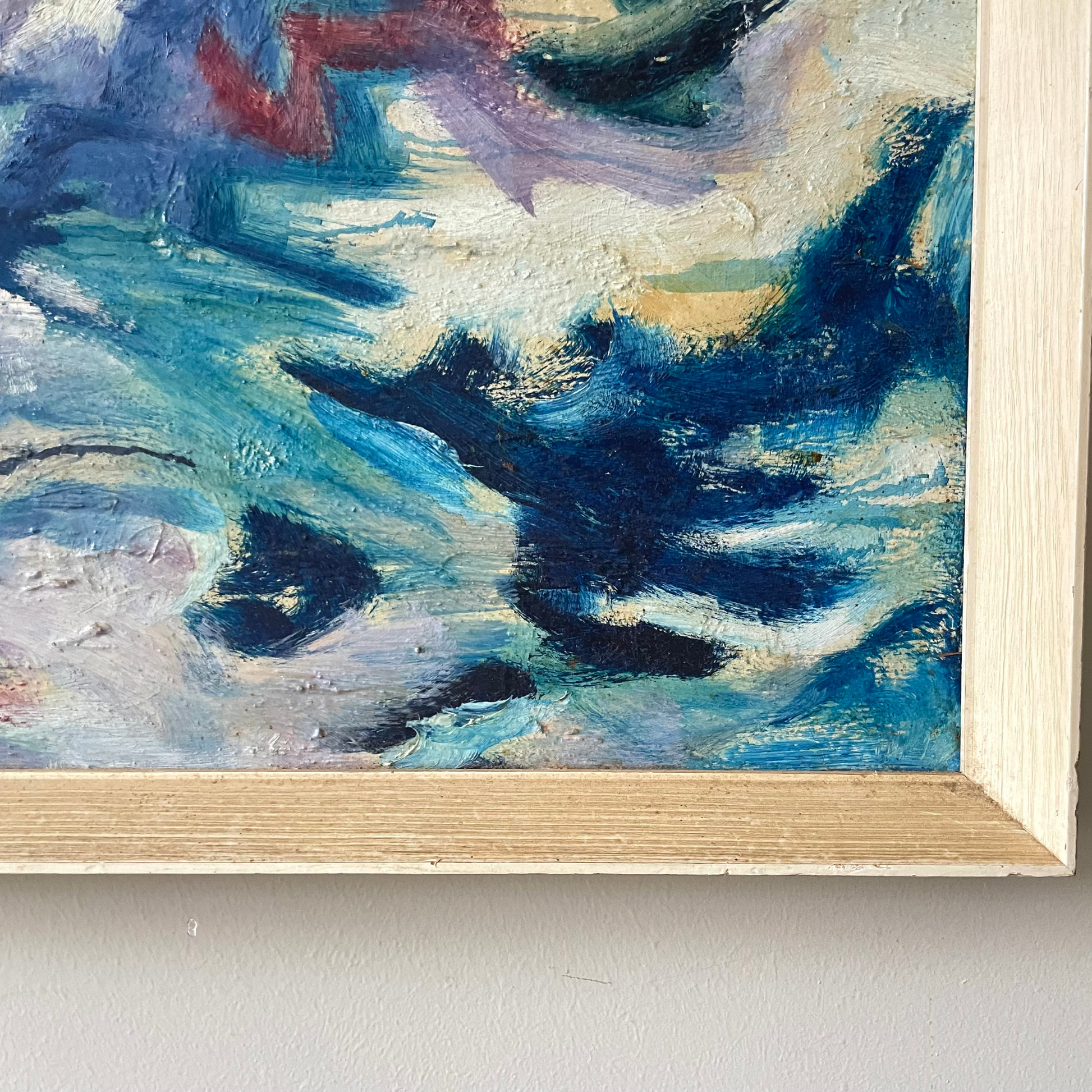 The painting features a dynamic blend of blues, whites, and hints of red and green, evoking a sense of movement and energy.