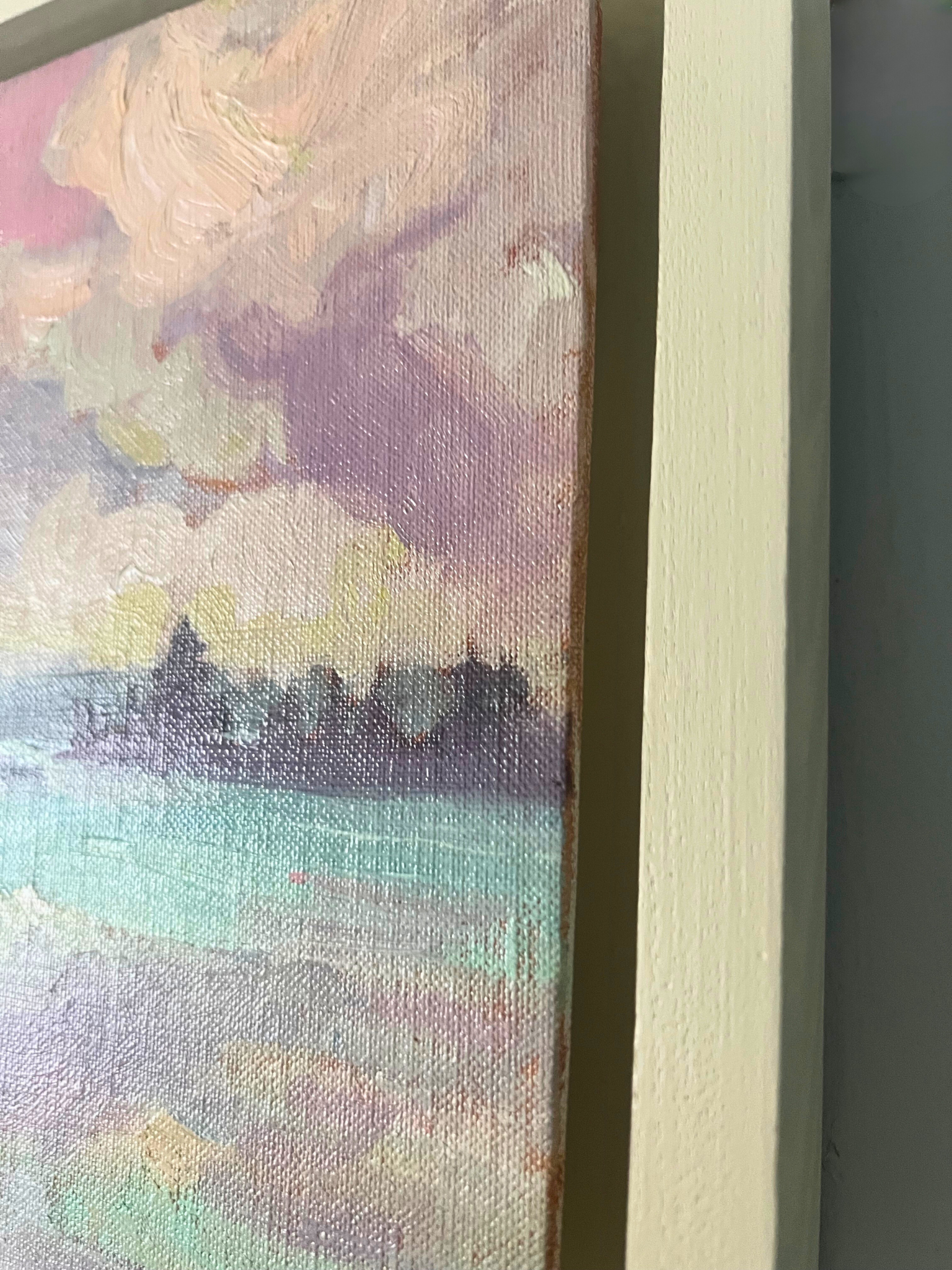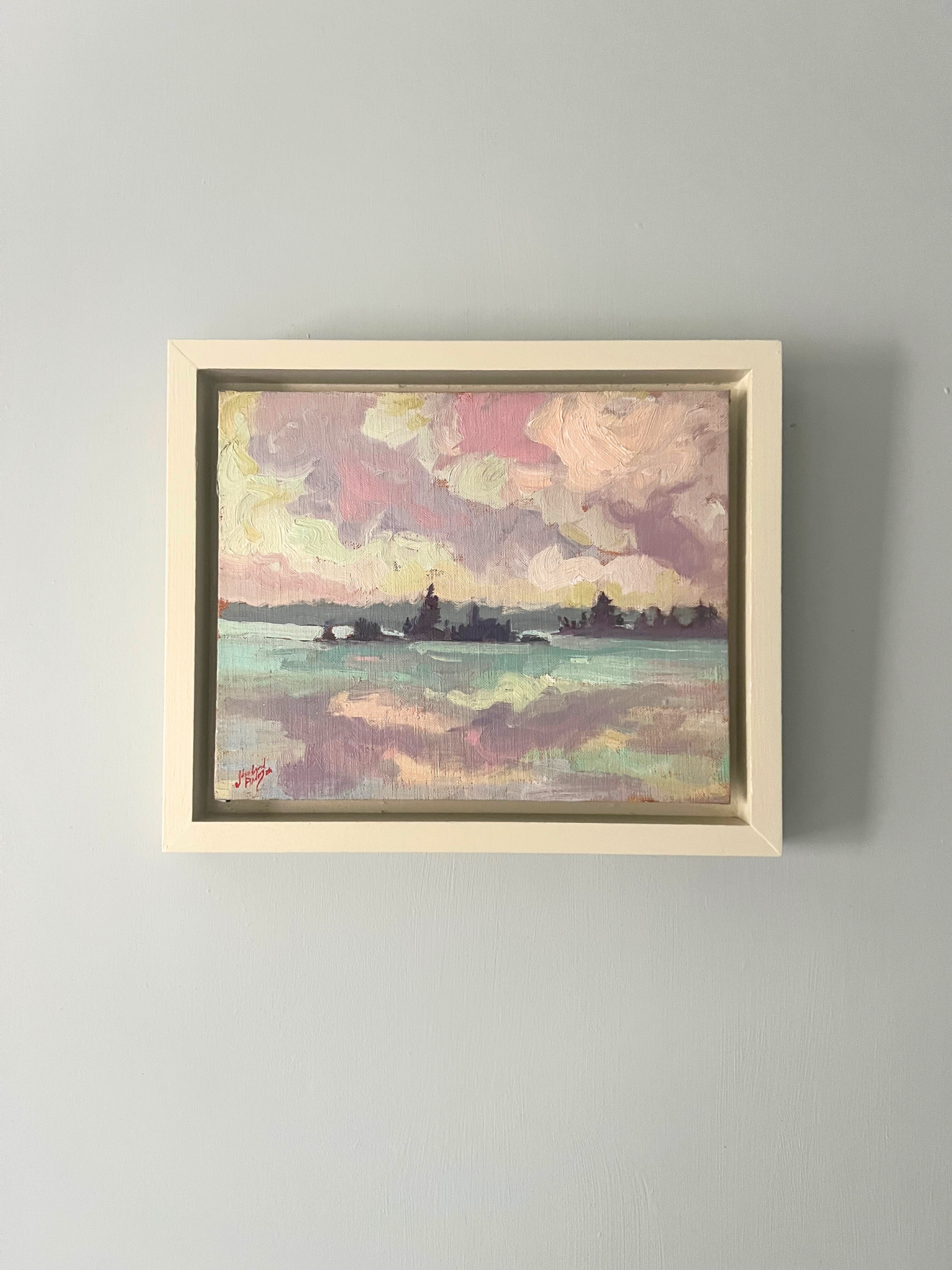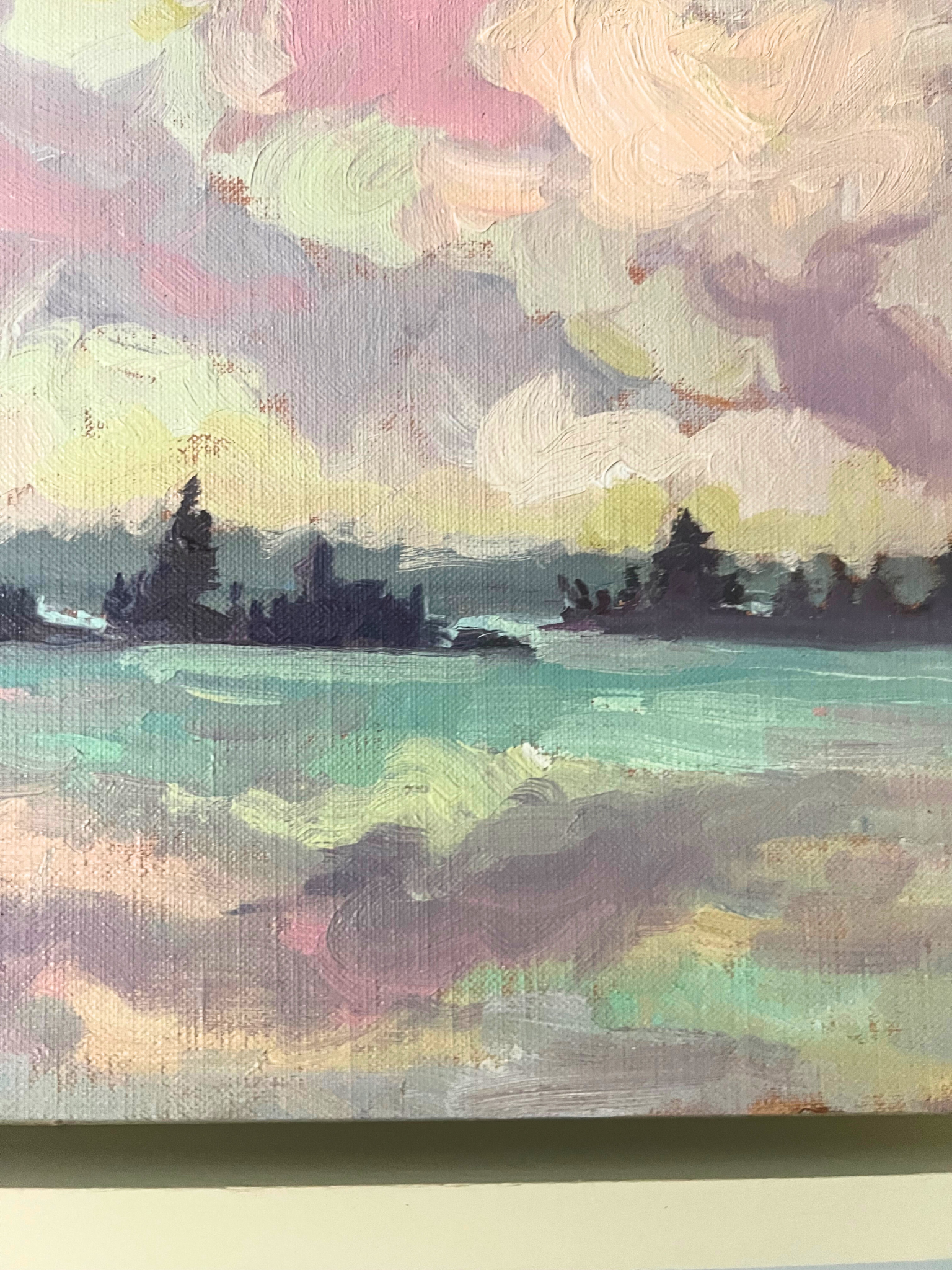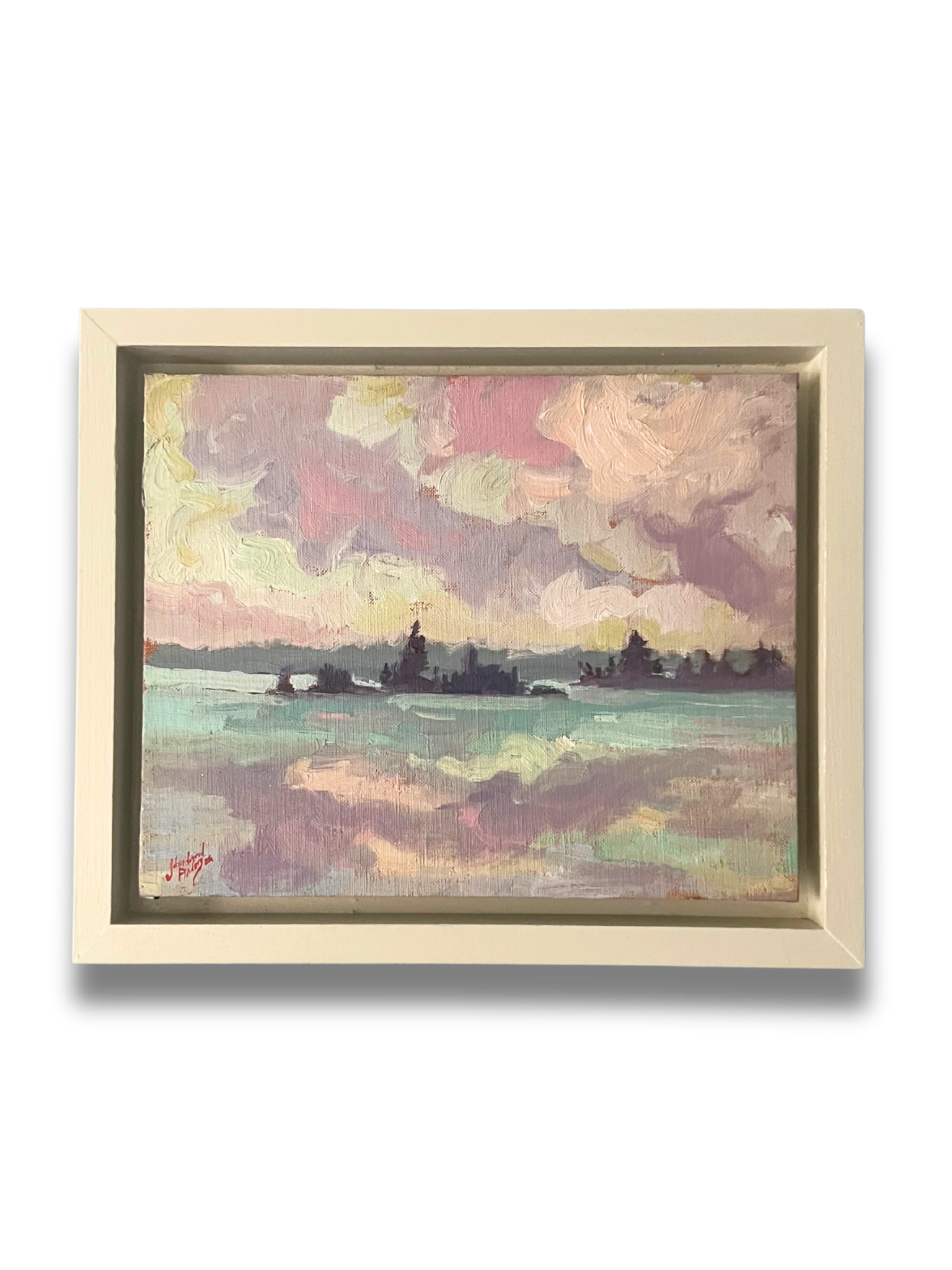 This plein air depicts the evening light over Six Mile Lake. Anderson records shifting tones with short, confident strokes, using a restrained palette to distinguish sky, water, and shoreline. The composition emphasizes the horizon and subtle changes in atmosphere.